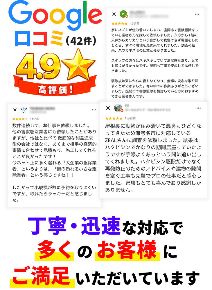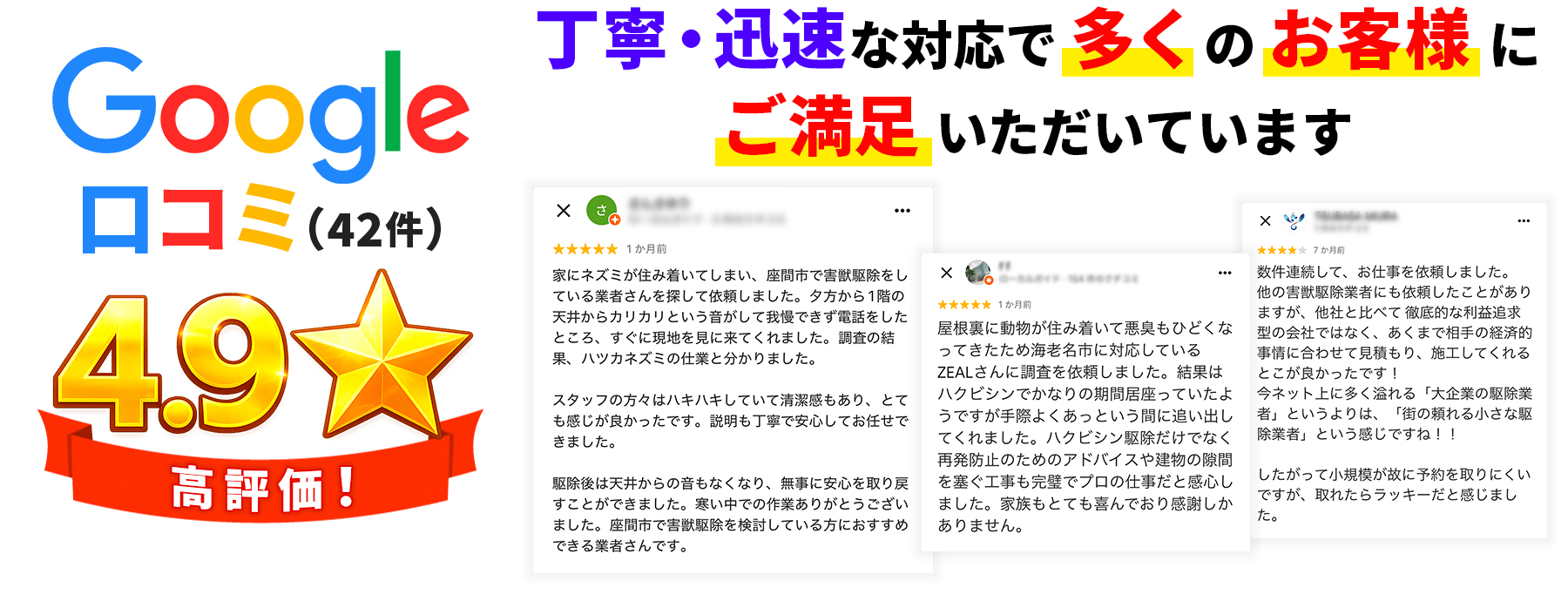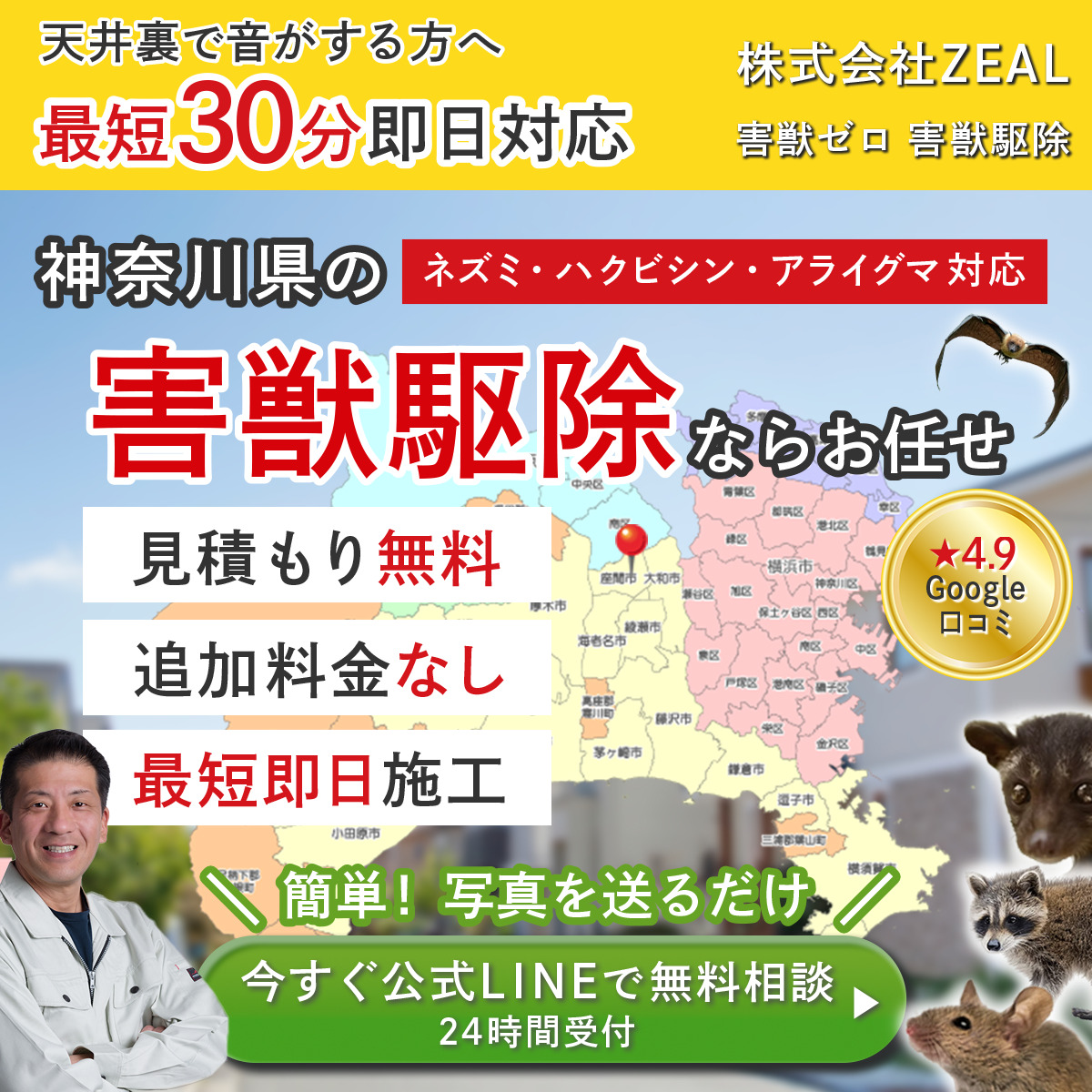 株式会社ZEALは神奈川県を中心に、東京・千葉・埼玉全域でも害獣駆除サービスを提供しております。害獣駆除(ハクビシン・ネズミ・コウモリ・アライグマ・タヌキ)についての専門知識に加え、高い除菌消臭技術で、お客様の家屋を過ごしやすい状態へ導きます。